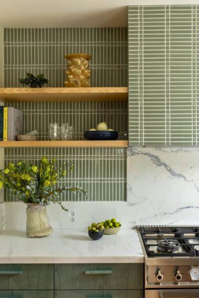 Transform your kitchen with vertical green tiles laid in thin strips for a sleek, modern backsplash. This design pairs wonderfully with natural wood shelves and marble countertops.