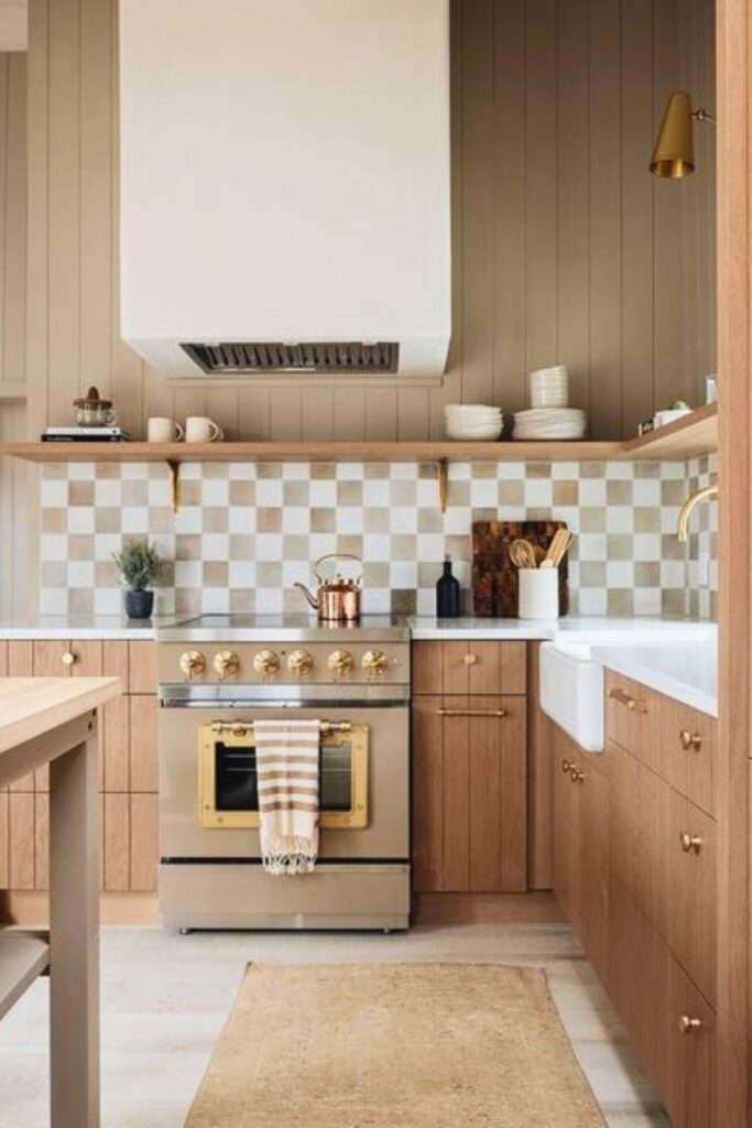 Add a playful touch with a checkered backsplash in warm beige and white tones.