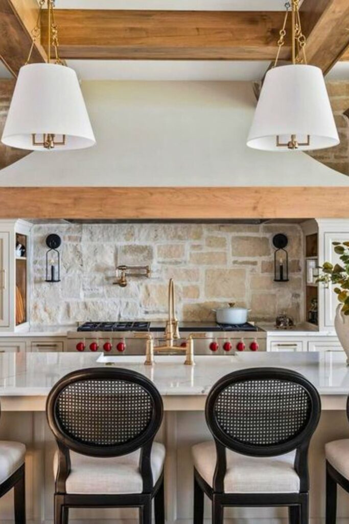 Bring rustic elegance with a stone backsplash that offers a timeless appeal. The rugged texture complements traditional features like a farmhouse sink and wooden beams.