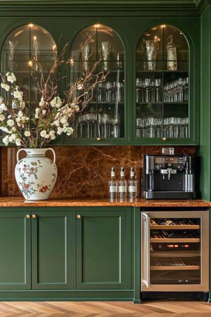 Transform your kitchen into a luxurious haven with a stunning dark forest green backsplash paired with elegant marble accents.