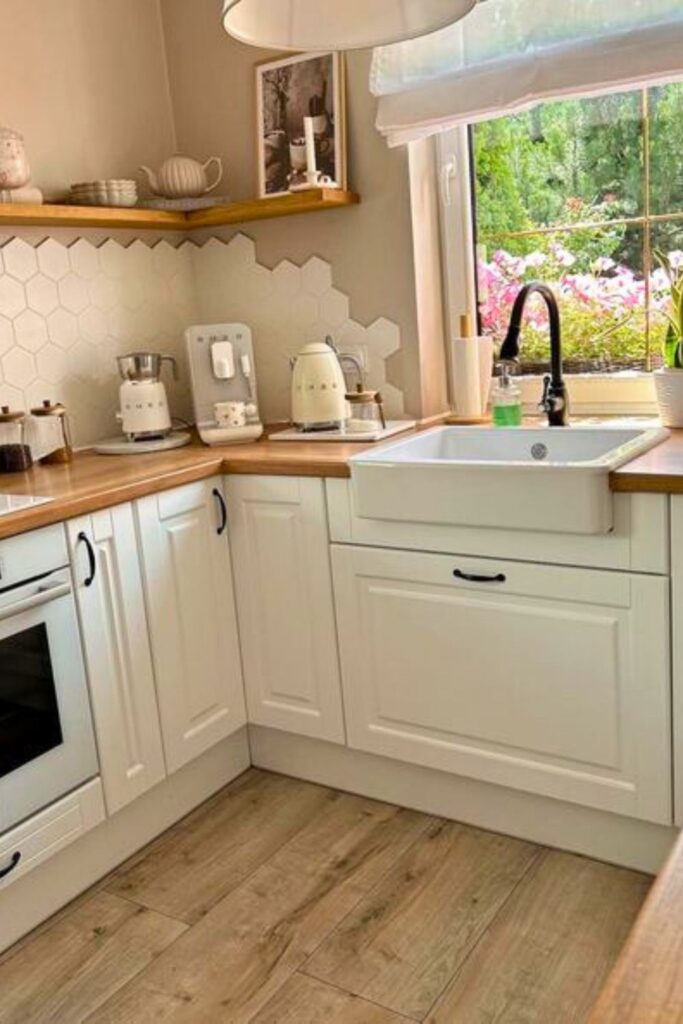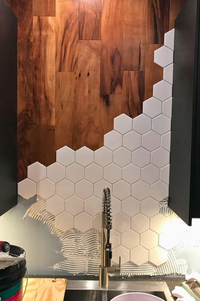 Transform your kitchen with a modern rustic vibe by combining white hexagonal tiles with a contrasting wood panel.