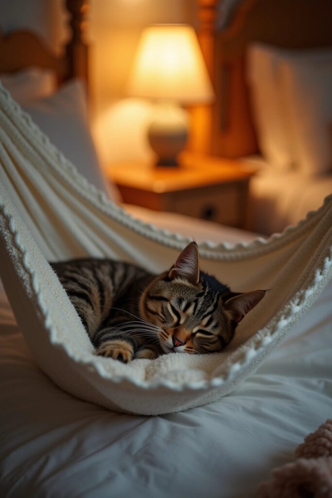 Design a cozy bedside retreat for your cat by installing a hammock under your bedside table.
