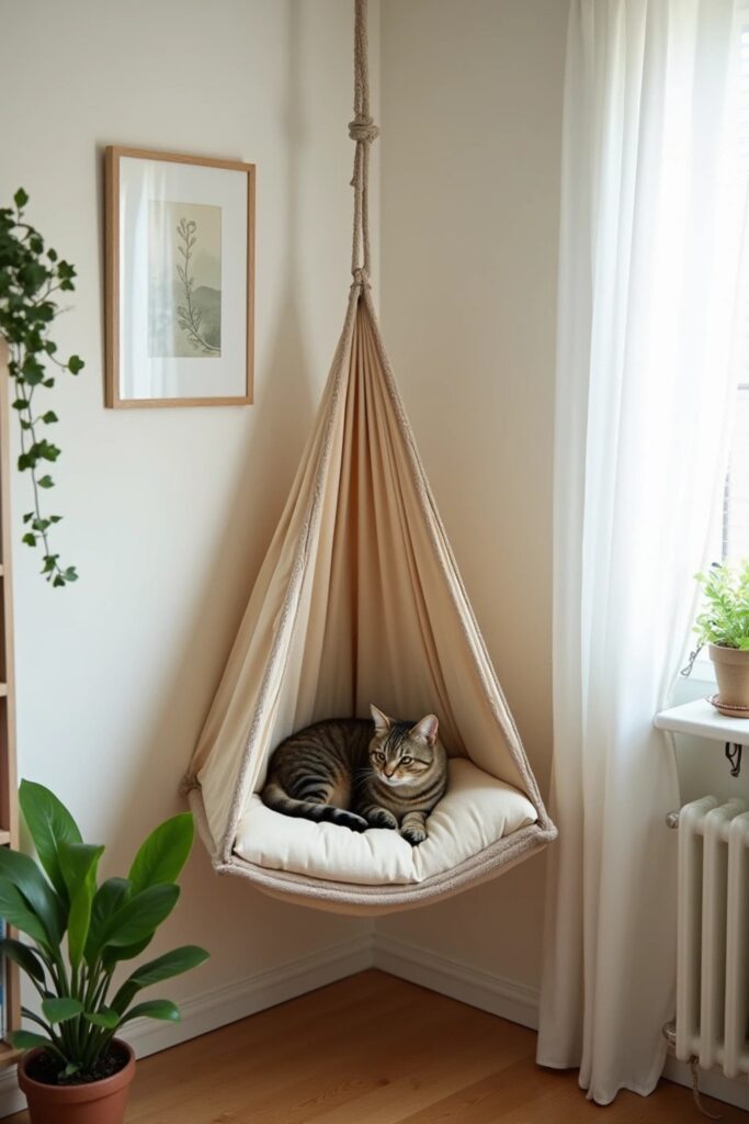 Turn unused corners into a cat-friendly nook with a triangular hammock made from soft fabric and attached to the walls with secure hooks.
