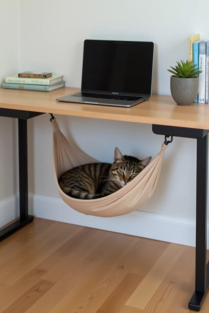 Make your workspace cat-friendly by attaching a hammock beneath your desk with adjustable straps.