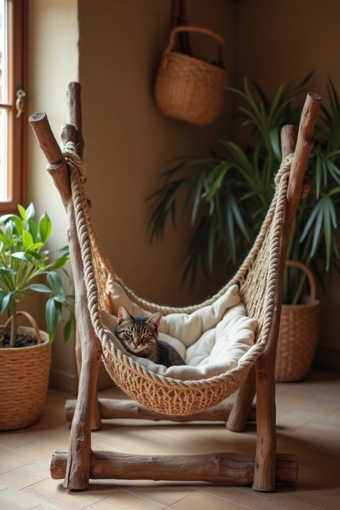 Create a rustic cat hammock by using reclaimed wood for the frame and thick, durable ropes to suspend the fabric.
