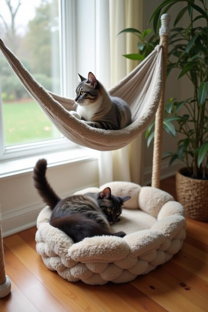 Combine the best of both worlds with a versatile hammock-bed combo. Use a small raised cat bed as the top layer and add a snug hammock below it.
