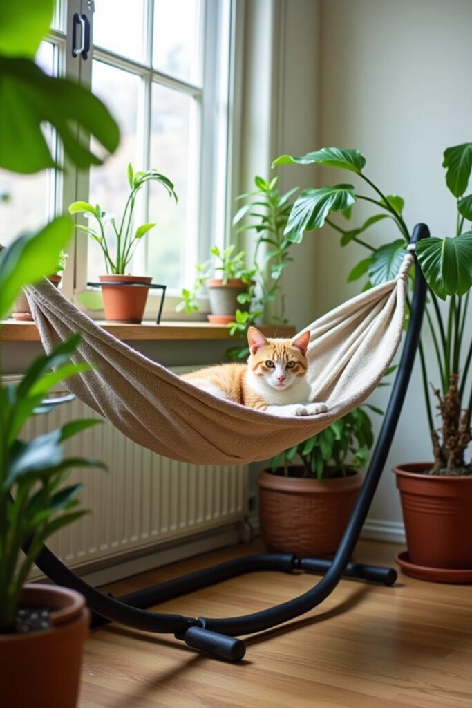 Elevate your space and blend your cat’s hammock into your greenery by attaching it to a sturdy plant stand.