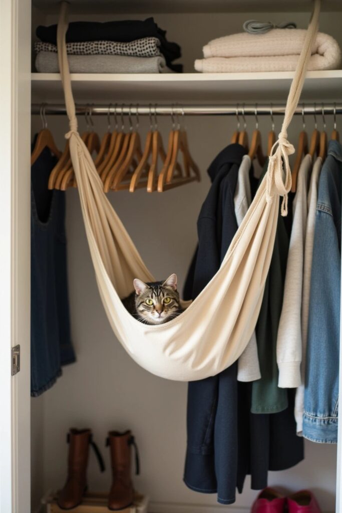 Turn your closet into a snug hideaway by hanging a hammock from the rod. Use heavy-duty fabric and adjustable straps for reliable support.