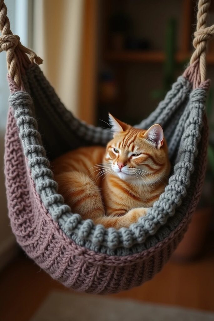 Craft a boho-chic hammock for your feline using soft cords and macrame techniques.