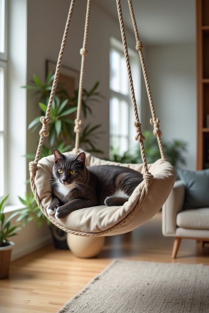 Create an adventurous perch with a ceiling-suspended cat hammock! Use hooks and ropes to hang a lightweight yet durable fabric or cushioned base.