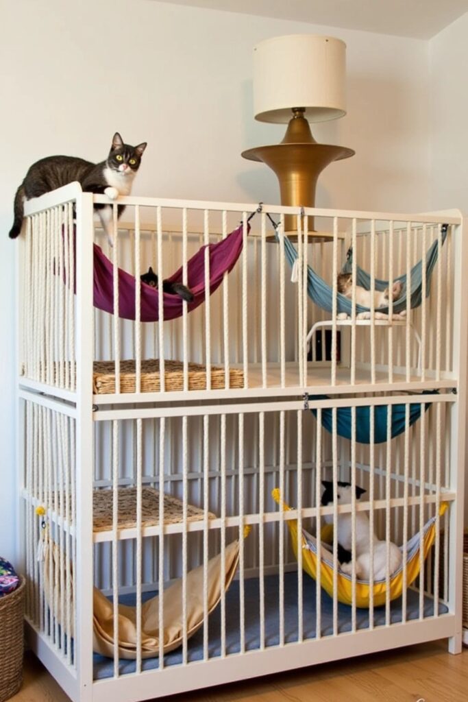 Repurpose an old crib into a multi-level lounging area by attaching hammocks between the slats with sturdy fabric or netting.