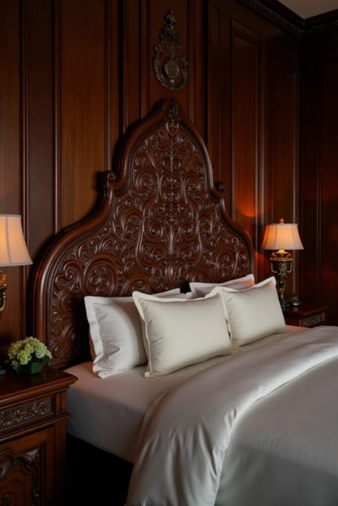 Introduce a sense of luxury and history to your room with an Ornate Carved Wood Headboard. This headboard captivates with intricate carvings in rich, dark wood, evoking an antique, regal atmosphere.