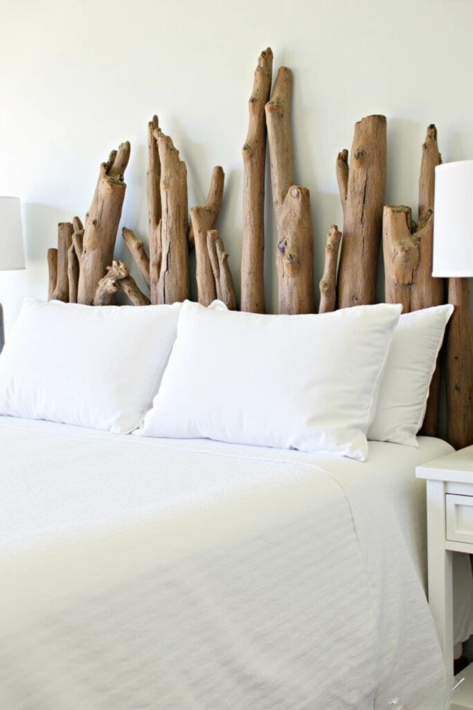 Use nails or screws to secure the wood pieces together. Be sure to sand down the surfaces to eliminate any rough spots. The charm of this headboard lies in its natural textures and visible knots, which add an authentic touch.