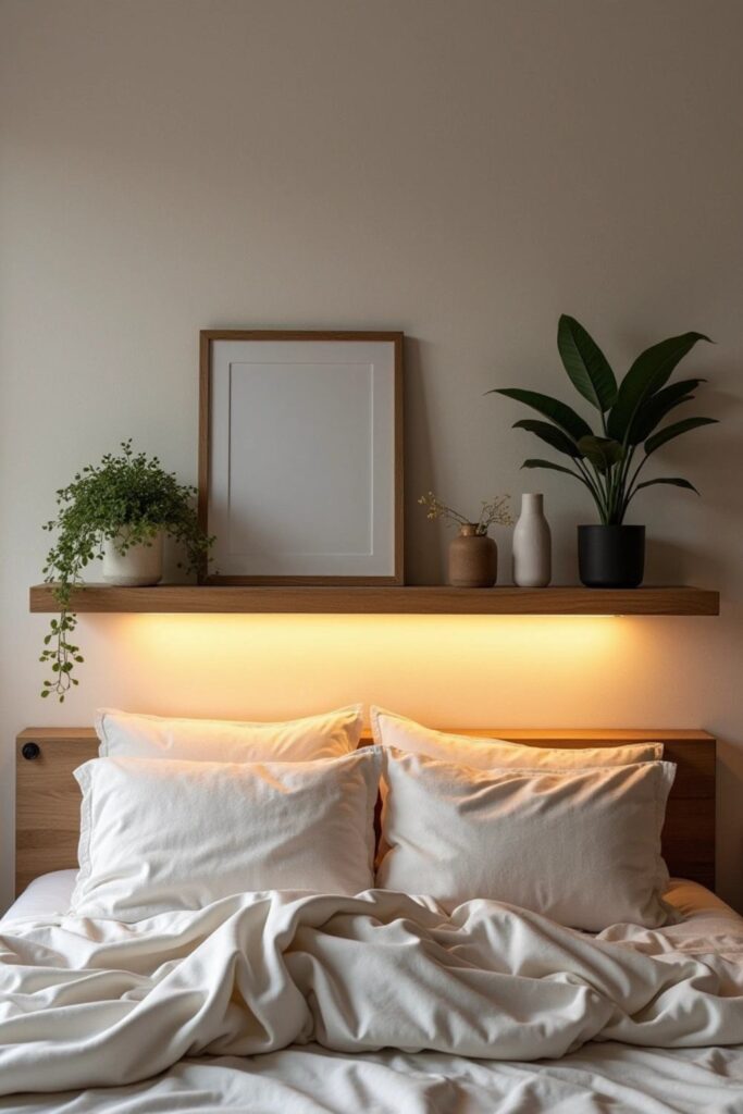 Transform your bedroom with a Floating Shelf Headboard that beautifully combines functionality and aesthetics. Install a sleek wooden shelf at headboard height, and attach an LED strip light underneath for a soothing ambient backlighting effect.