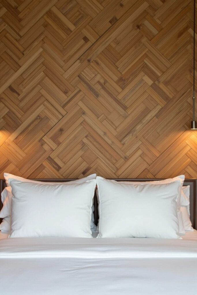 Create a striking focal point with a wood panel grid headboard by combining various wood tones in a grid layout.