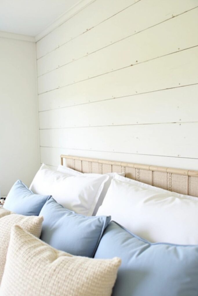 Attach wide wooden planks horizontally across the wall, leaving slight gaps to achieve the classic shiplap effect. Paint the wood in a soft white or ivory tone to evoke a farmhouse-inspired look.