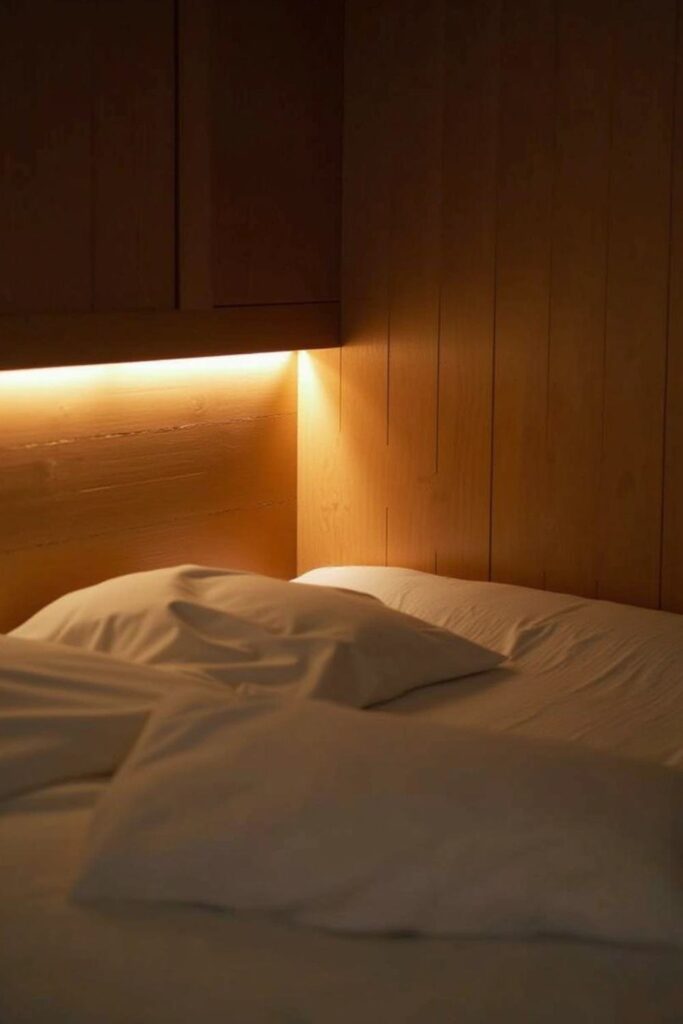 This clever setup casts a cozy glow, making it perfect for bedrooms emphasizing a modern or Scandinavian touch.