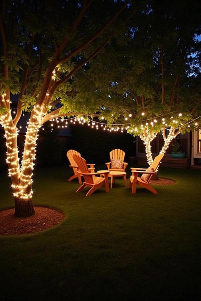 Arrange Adirondack chairs around a small table beneath the lights, making it a perfect spot for evening relaxation or get-togethers.