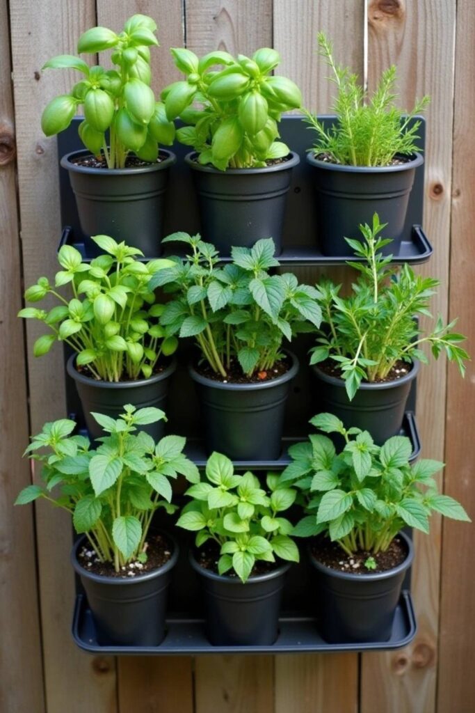 Attach small pots filled with soil and your favorite herbs like basil, mint, and rosemary to a vertical frame or fence.
