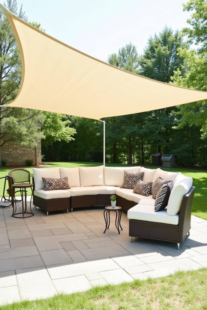 Make your backyard more cozy and shaded with a DIY shade sail. This triangular canopy offers a stylish and useful sunshade over an outdoor seating area, protecting you from strong sunlight.