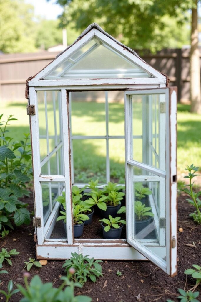 Repurpose old window frames to create a mini greenhouse that adds both functionality and charm to your backyard.