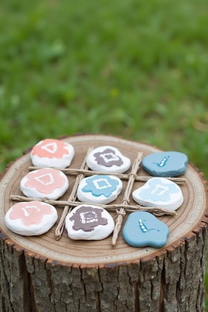 Select flat stones, paint them with contrasting designs, and arrange a tic-tac-toe grid with thin sticks or twine on a wooden surface.
