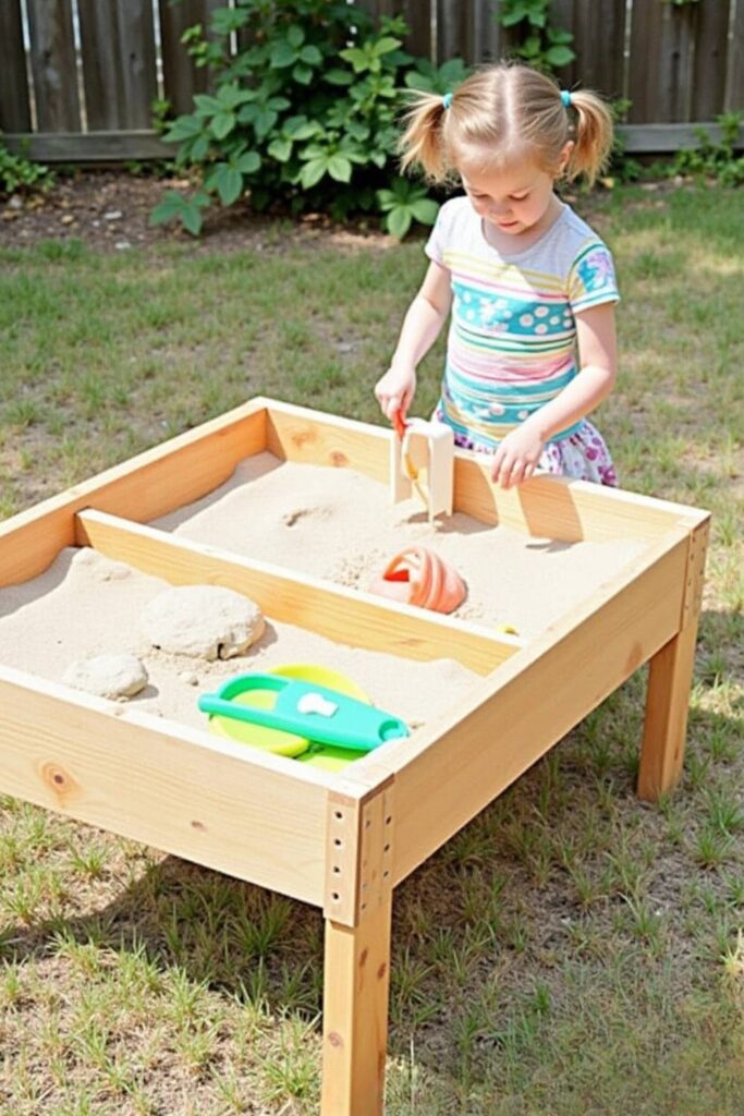 Construct a wooden frame with legs, then fill it with clean sand, creating a designated space for digging, building, and sensory play.