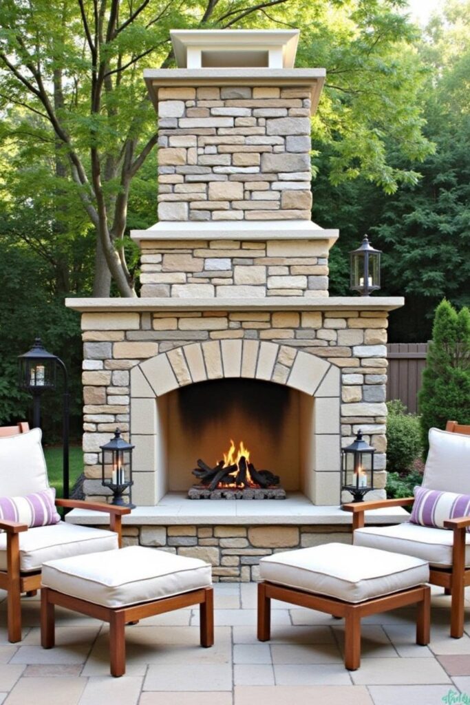 An outdoor stone fireplace serves as a stunning focal point, perfect for intimate gatherings. Build a classic structure with a firebox, chimney, and hearth using natural stone for a rustic feel.