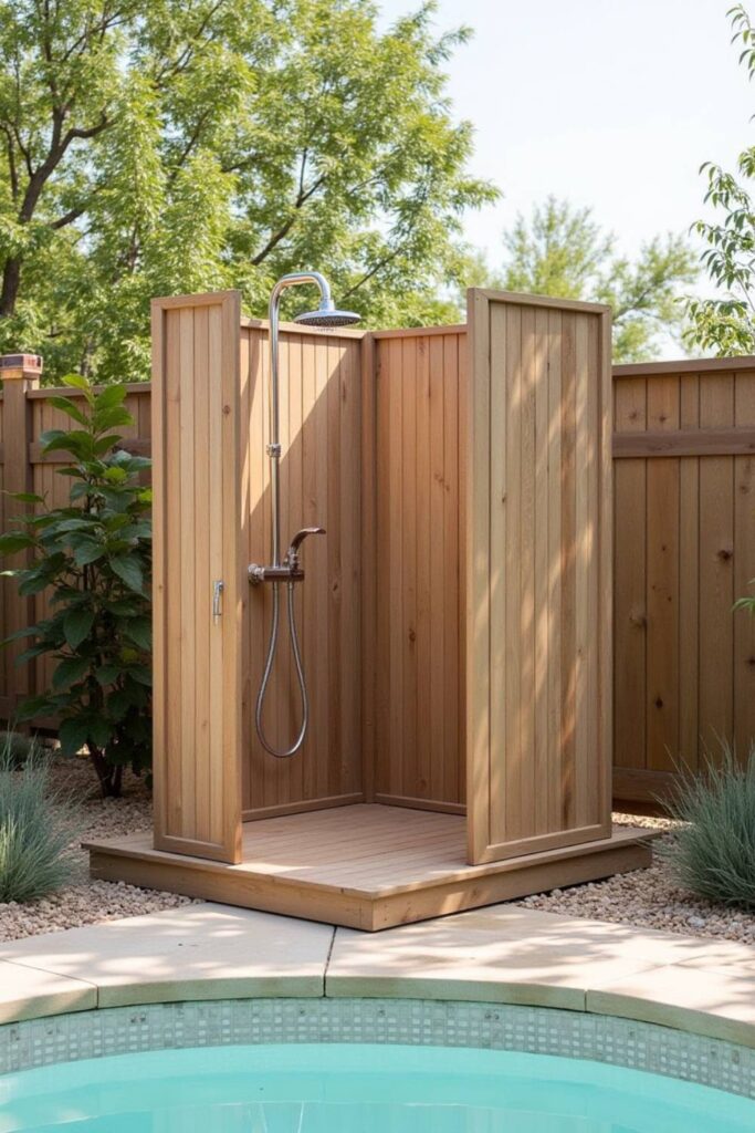 Perfect for poolside areas, this shower offers a comfortable spot for guests to clean off. Start by building a solid wooden base, then attach walls with durable, treated wood.