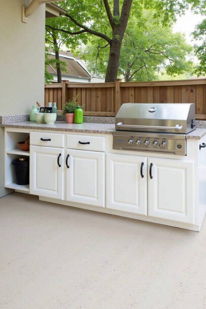 Position the countertop close to your grill for easy access, and choose finishes that withstand the elements. Add shelves for utensils and, if possible, integrate a small sink.