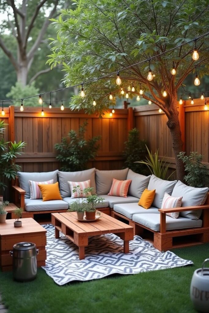 Hang the lights from nearby trees or along your fence. Potted plants add a touch of greenery, transforming your backyard into a delightful outdoor living room.