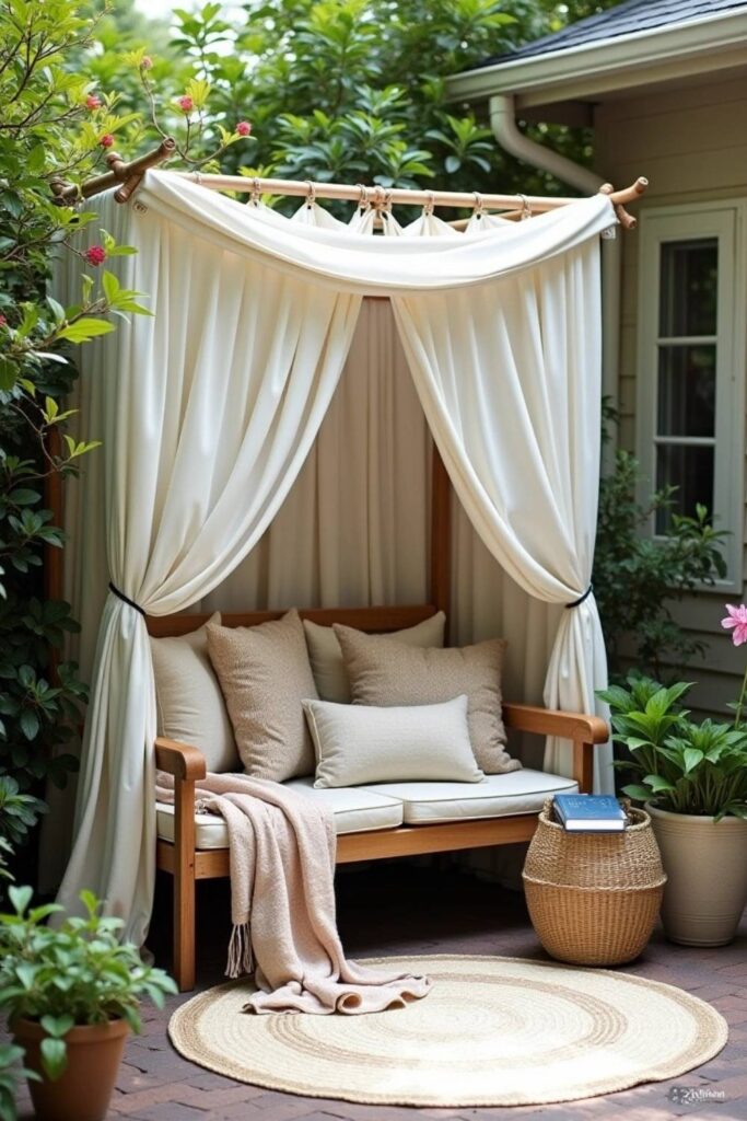Turn your backyard into a serene haven with a canopy lounge nook. This charming spot features a wooden frame draped in soft, white curtains, crafting a breezy, private nook ideal for unwinding.