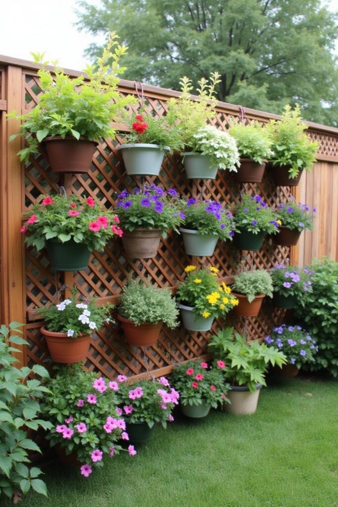 Create a serene escape in your backyard with a privacy wall adorned with hanging planters. Construct a wooden wall that not only offers seclusion but also serves as a vertical garden.