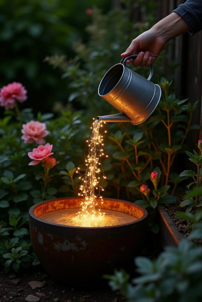 Bring a touch of magic to your garden with a watering can light fountain. Picture a metal watering can filled with warm fairy lights, tilted to resemble water pouring into a flower bed.