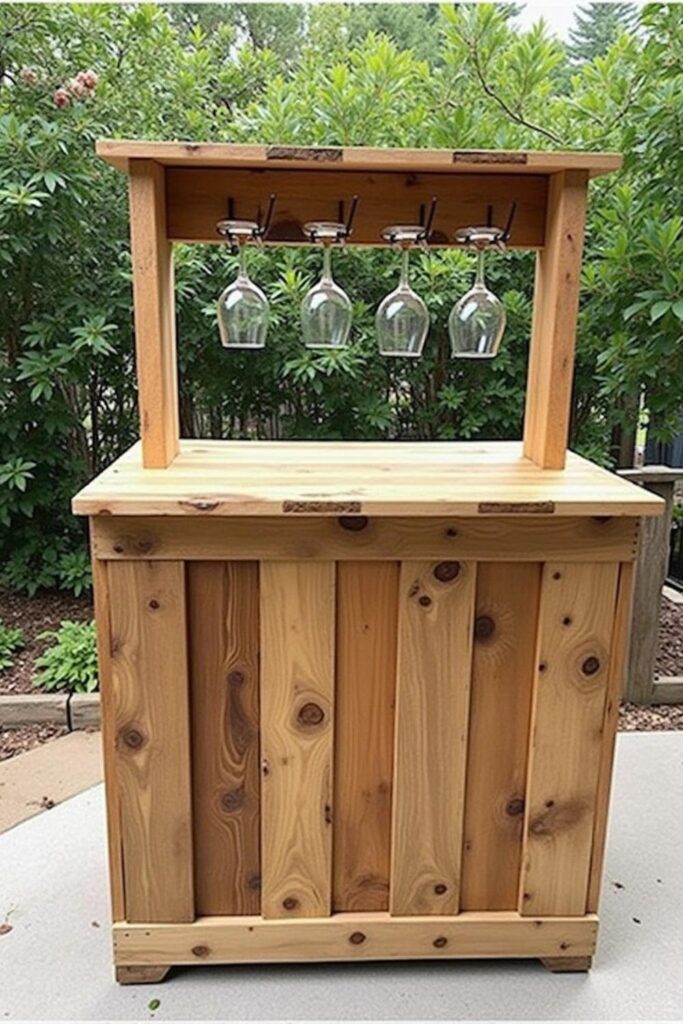 Elevate your outdoor gatherings with a DIY outdoor bar that promises both style and functionality. Construct this inviting feature using wooden planks to create a simple yet elegant bar complete with a counter and a shelf for hanging glasses.