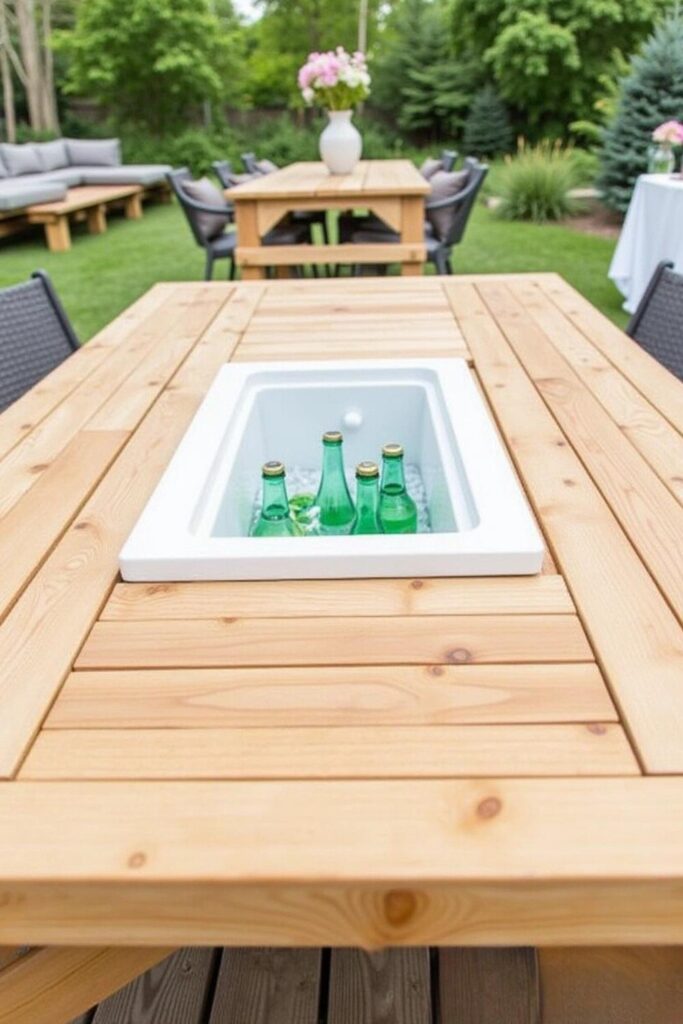 Made from strong wood, this table combines style and functionality, enhancing any outdoor dining area. To create this, use or make a wooden table and cut out a space in the center to fit an insulated tub or cooler.