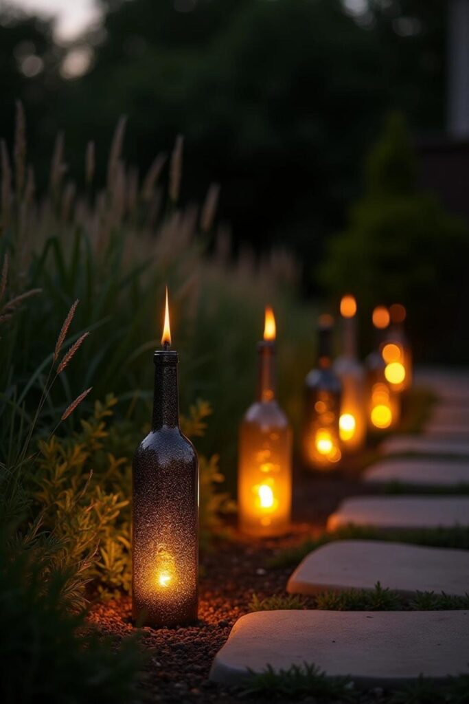 Fill them with citronella oil and add wicks. This keeps bugs away while providing a warm, cozy glow. Place these torches along garden paths or near seating areas.