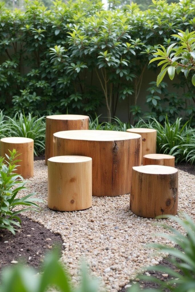Create a charming outdoor space with a tree stump table and chairs set. Use different-sized tree stumps as chairs around a larger stump for the table.