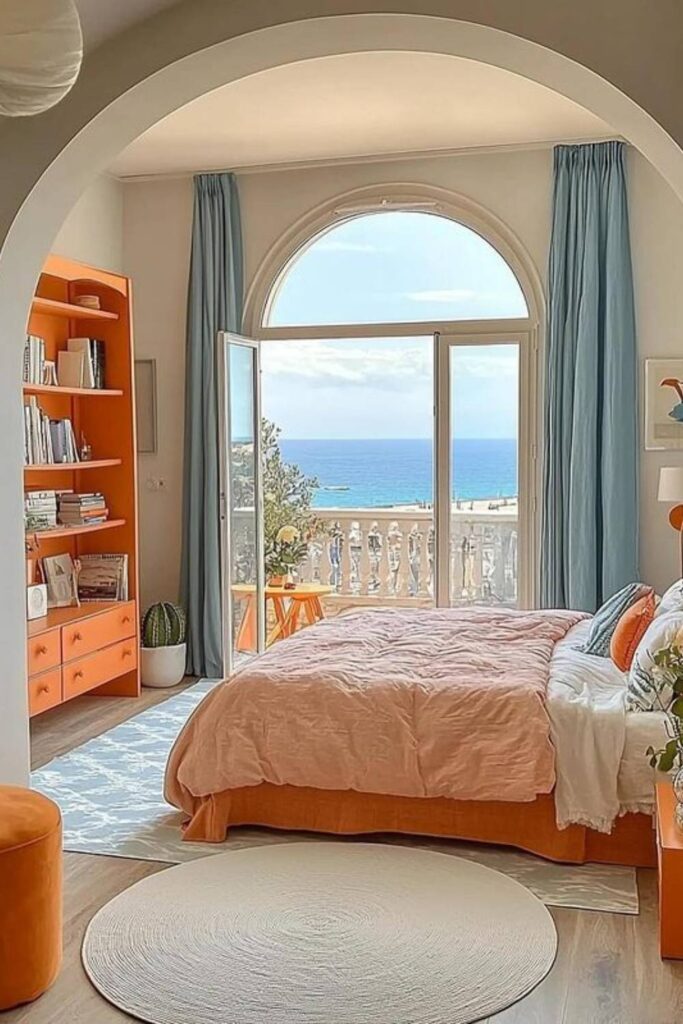Create a bright coastal retreat by using lively orange accents and light, airy elements. Place your bed near a large window or balcony for a scenic view, and choose light bedding to contrast with bold colors.