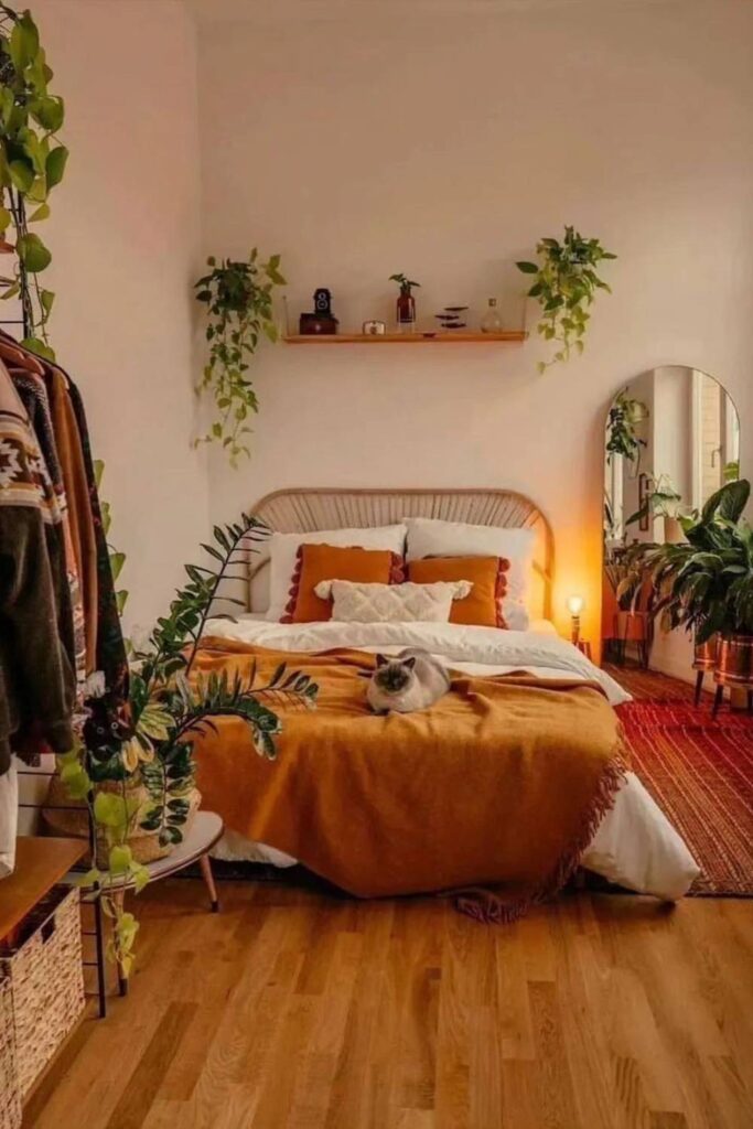Transform your bedroom into an earthy boho sanctuary by mixing warm tones like terracotta and sage with natural textures. Introduce a variety of plants to breathe life into the space.
