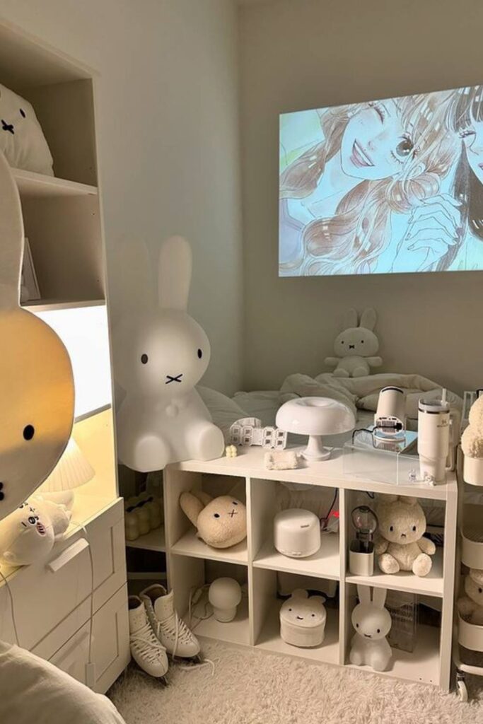 Design a character-themed room using plush toys and minimalistic furniture. Project a favorite character on the wall for added visual charm, and organize toys on a storage shelf.