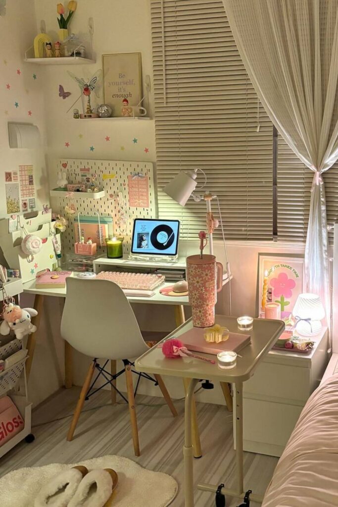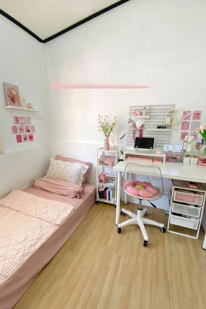 Transform your study area into a pink paradise with pastel pink accents and clever storage solutions. Hang a pegboard above the desk to neatly organize stationery and cute decor pieces.