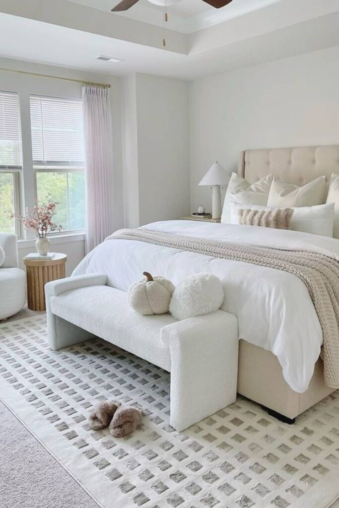 Place a neutral bench at the bed’s foot and a soft throw for added warmth. Decorate the bedside with vases and gentle lighting for a minimalistic yet inviting atmosphere.