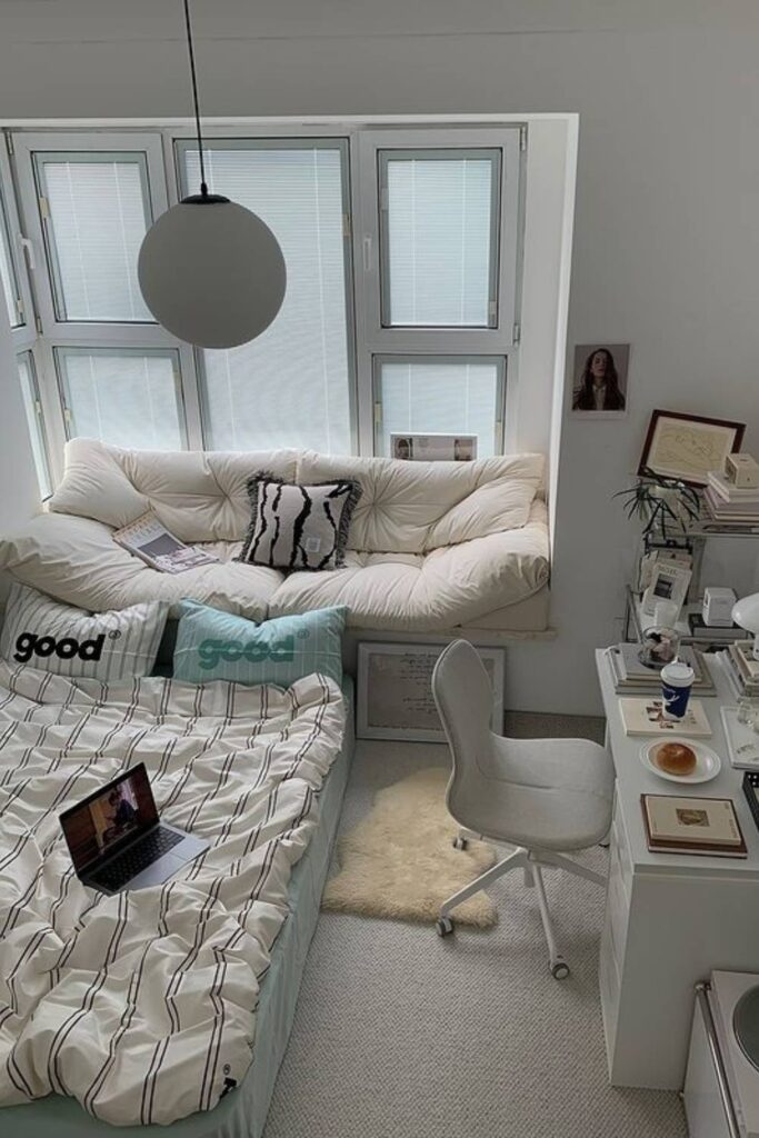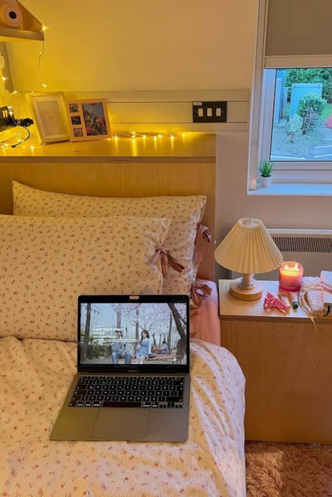 Introduce a white curtain over the window to create soft lighting, and add a touch of magic with fairy lights above the bed for a cozy touch. Keep your space neat with colorful stationery and a laptop stand.