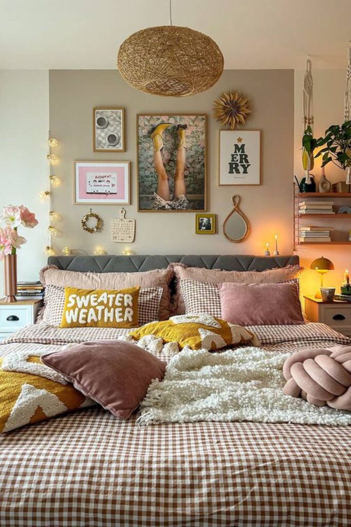 Bring the warmth of autumn into your bedroom with an autumn-themed gallery wall. Use framed art, posters, and mirrors in earthy tones to adorn the space above your bed.
