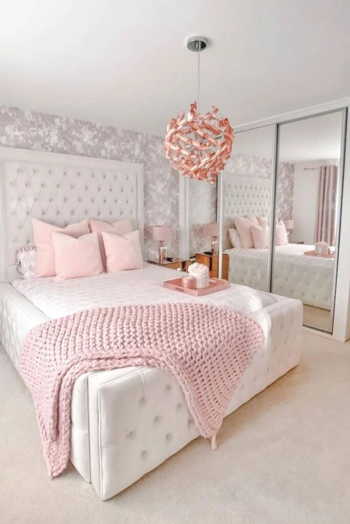 Start with a tufted headboard and layer your bed with blush pink pillows and a chunky knit throw for coziness. Add mirrored nightstands and a metallic pendant light to boost the glamour.