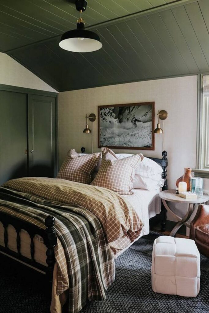 Design a cozy rustic bedroom with deep greens, plaid patterns, and natural wood elements. Choose a dark wood bed frame and layer your bed with plaid and neutral bedding to add warmth.