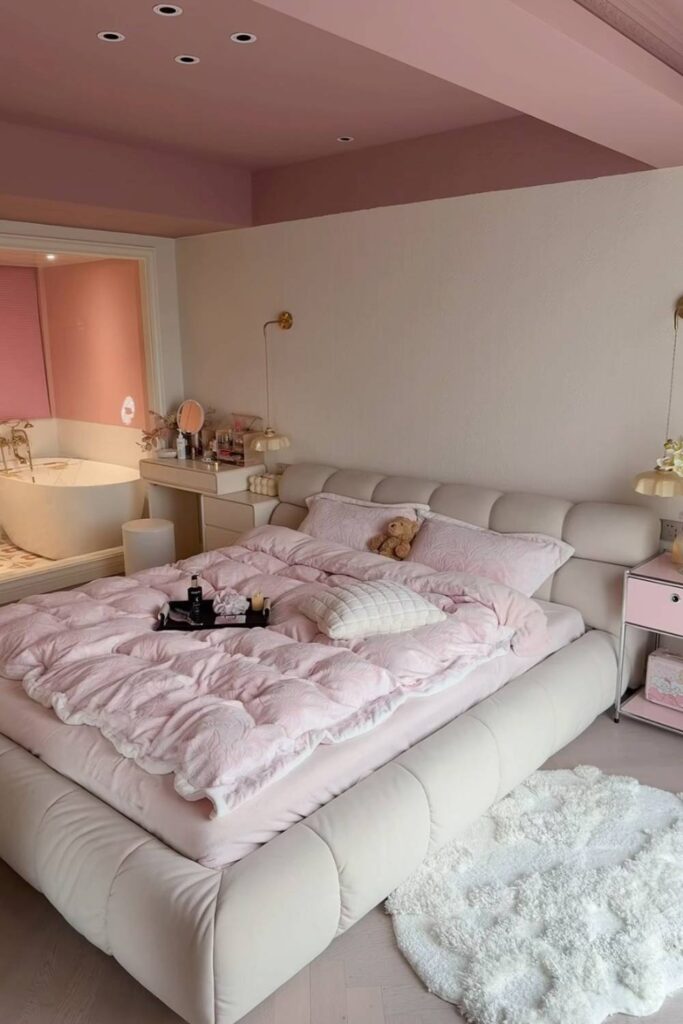Create a soft pastel retreat with a minimalist touch using gentle tones like light pink and beige. Opt for a low-profile bed with a tufted headboard and add soft bedding and pillows.