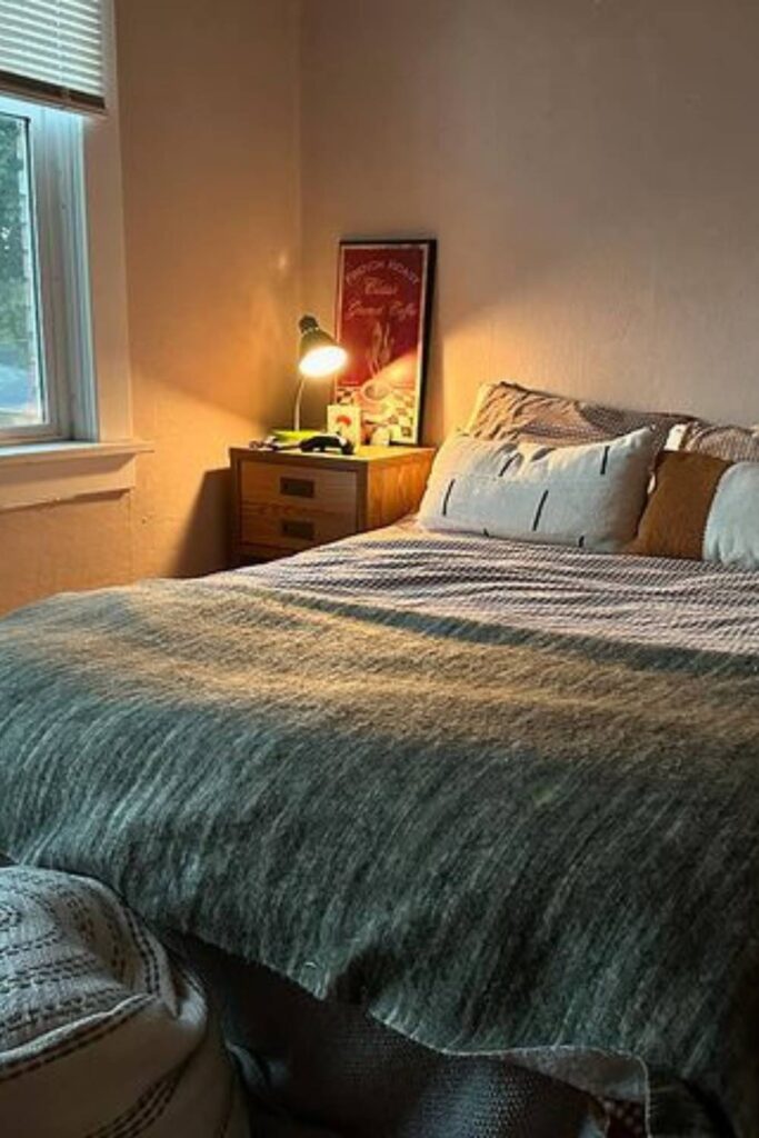 Enhance comfort with a mix of decorative pillows and a plush comforter. Add personality with indoor plants and framed artwork.
