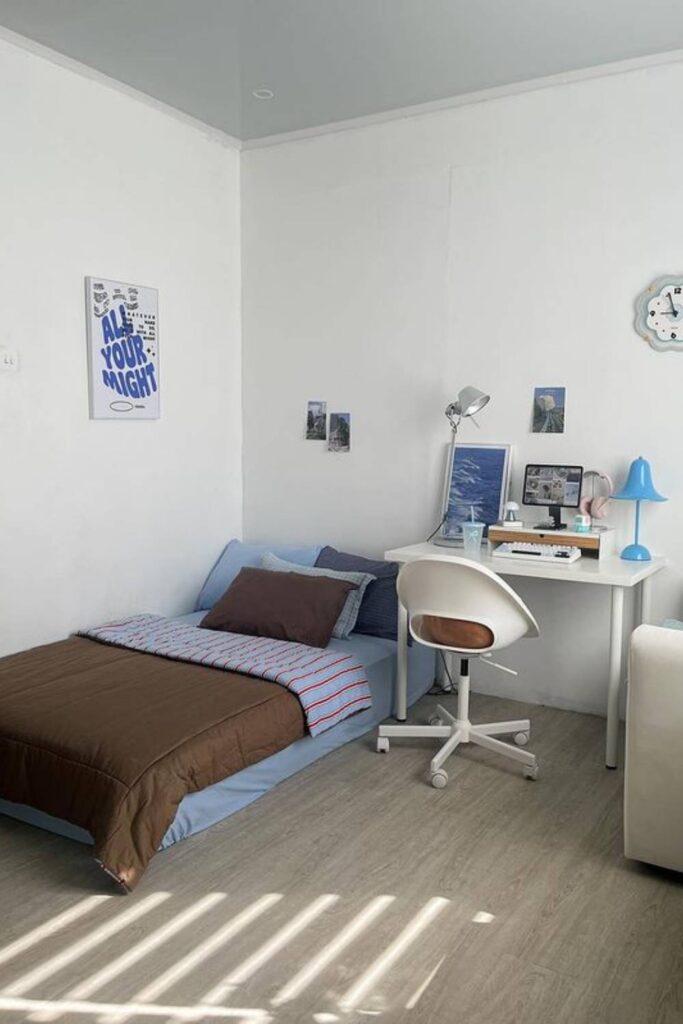 Paint the walls white and keep decorations minimal, like a motivational poster and personal photos. Add a pop of color with a blue desk lamp and matching decor.